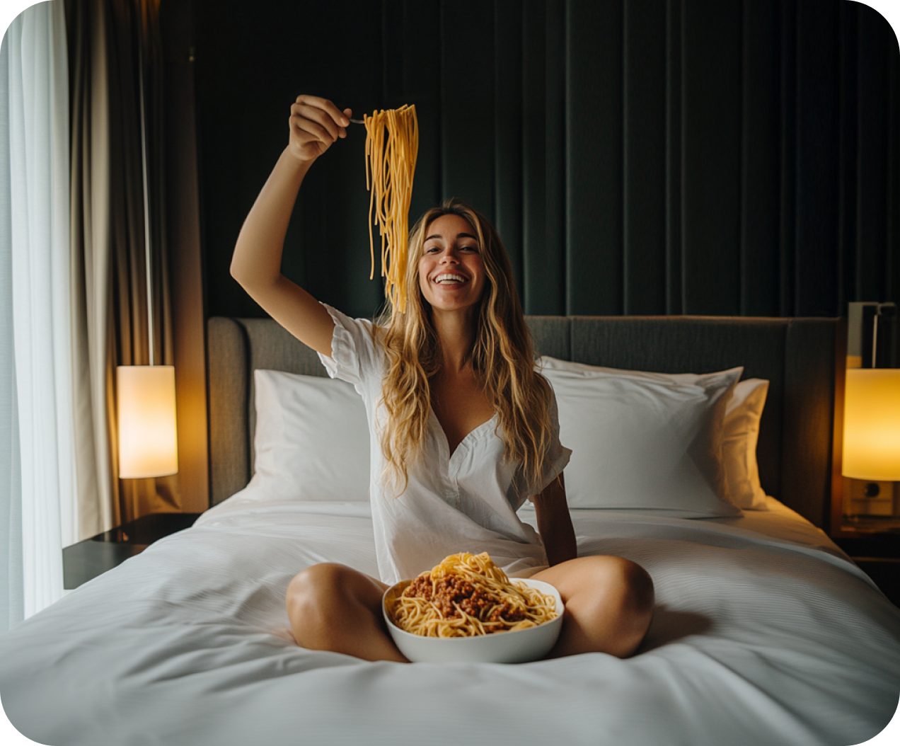 Die Bildsprache zeigt eine Kombination aus glücklichen Menschen, stilvoller Hotelausstattung und einer Atmosphäre, die Nachhaltigkeit und Geborgenheit vermittelt. Humorvolle Bilder sorgen für Aufmerksamkeit und verleihen der Marke einen lebendigen Charakter.