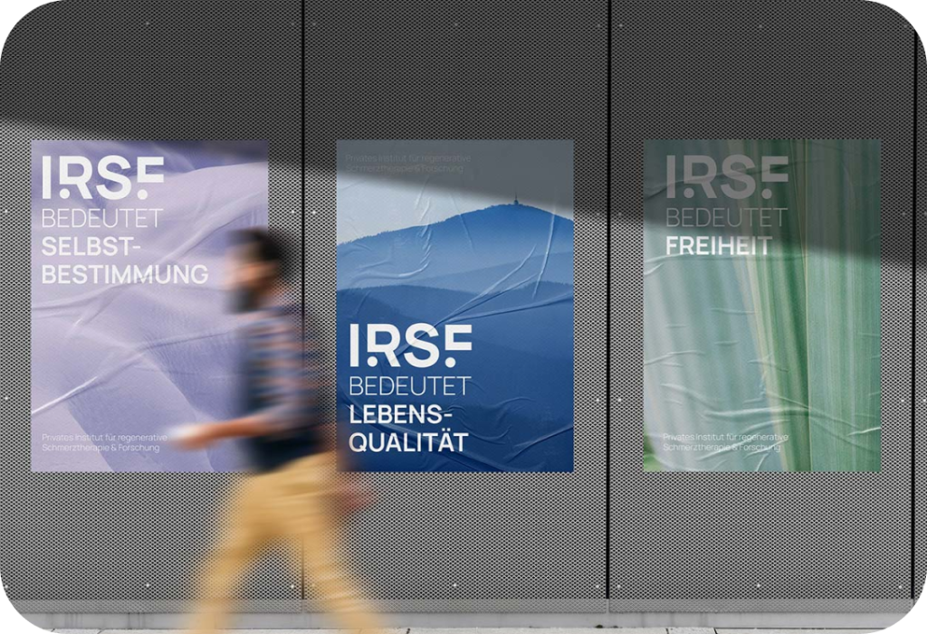 Kontrastreich, natürlich und mit beruhigender Wirkung – das Corporate Design von IRSF verbindet Schmerzfreiheit und Gesundheit mit einem erfrischenden Look, der Hoffnung weckt.