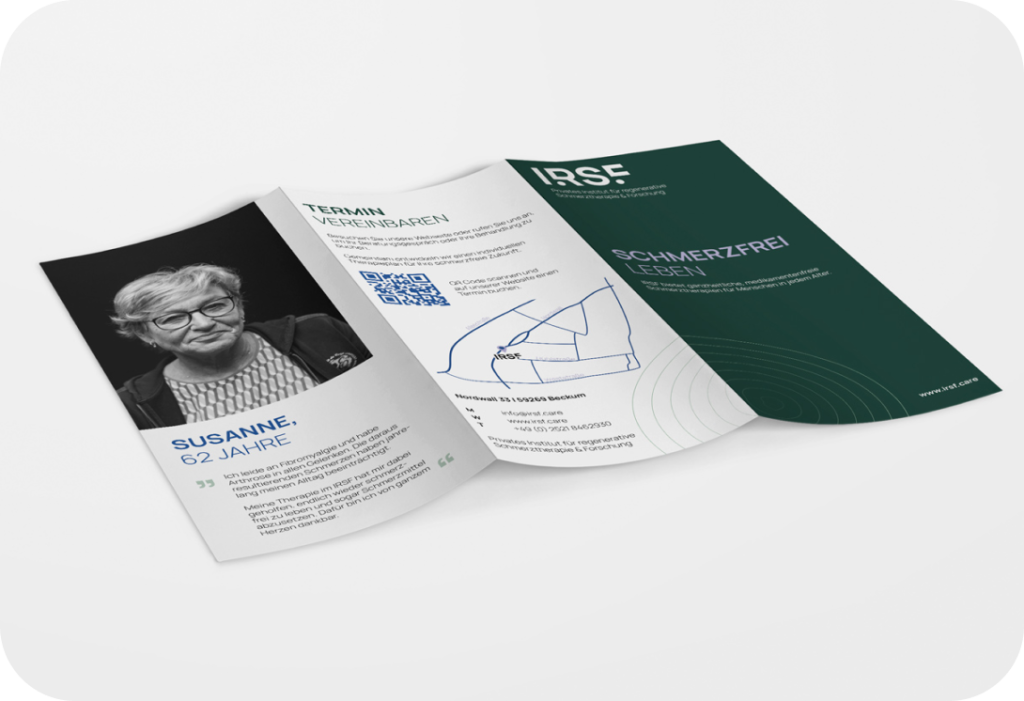 Das private Institut für regenerative Schmerzanwendung (IRSF) bietet medikamentenfreie Schmerzanwendungen für Menschen jeden Alters an. Neben dem Corporate Design sind wir für die Website des Startups verantwortlich und beraten die Geschäftsführung zum Aufbau eines skalierbaren Franchise-Geschäftsmodells.