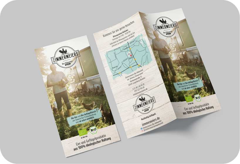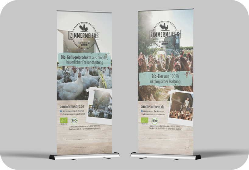 Für Zimmermeiers gestalten wir Printmaterialien, die am Point of Sale überzeugen: Rollups für Märkte und Events, Flyer mit Produktinfos – authentisch, klar und regional verwurzelt.